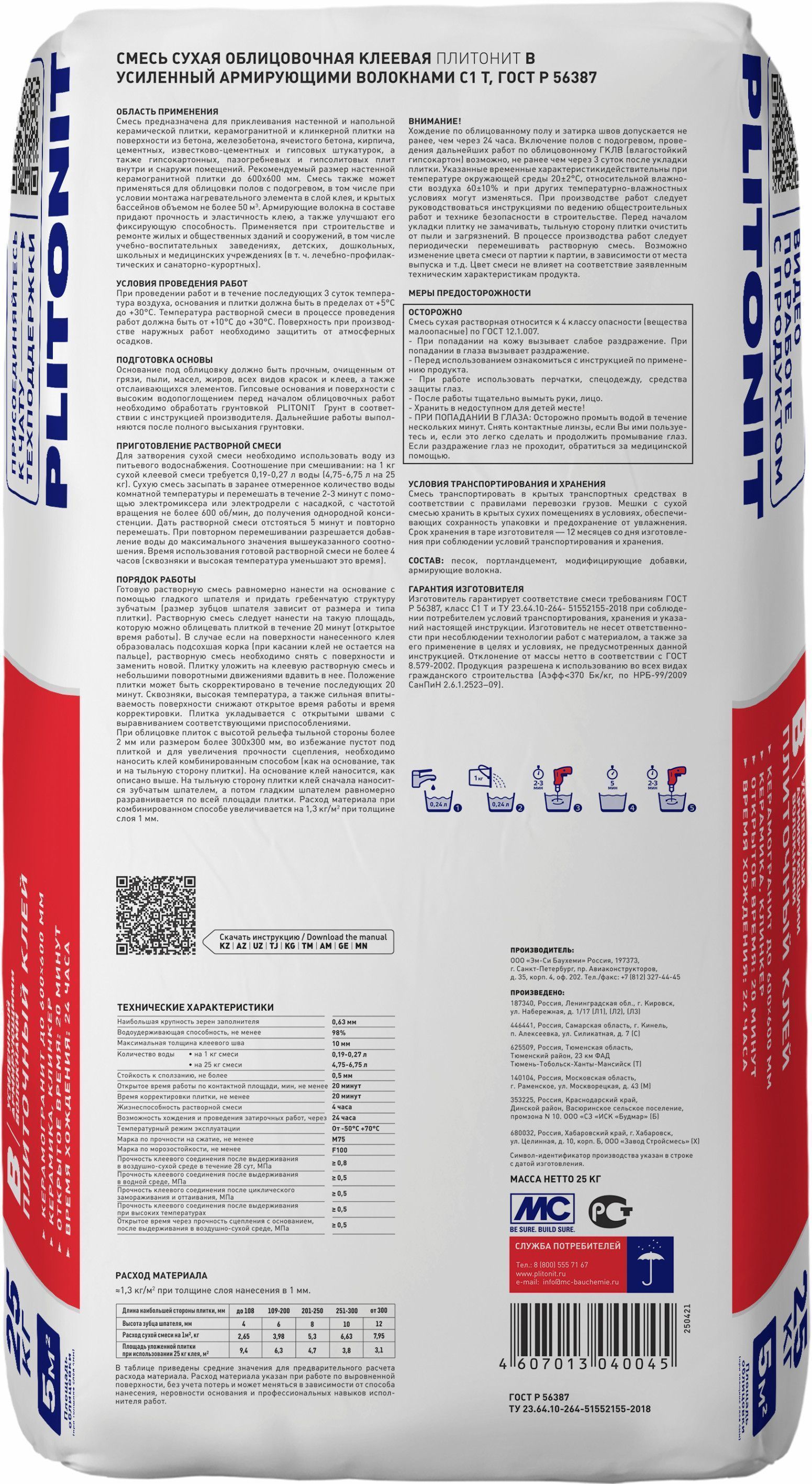 Клей для плитки Плитонит В, 25 кг Усиленный с армирующими волокнами С1 Т ГОСТ Р 56387-2015 .(48)
